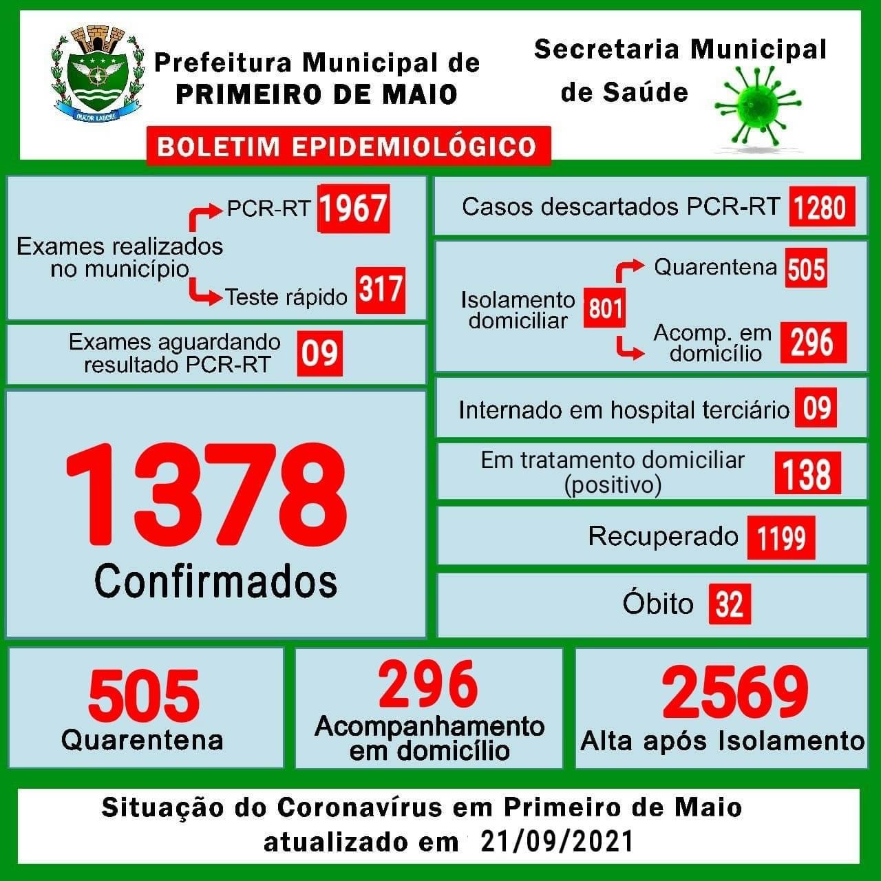 Mesmo com uma boa parte da população vacinada, o atual boletim oficial da cidade de Primeiro de Maio, confirma 138 casos confirmados positivos.