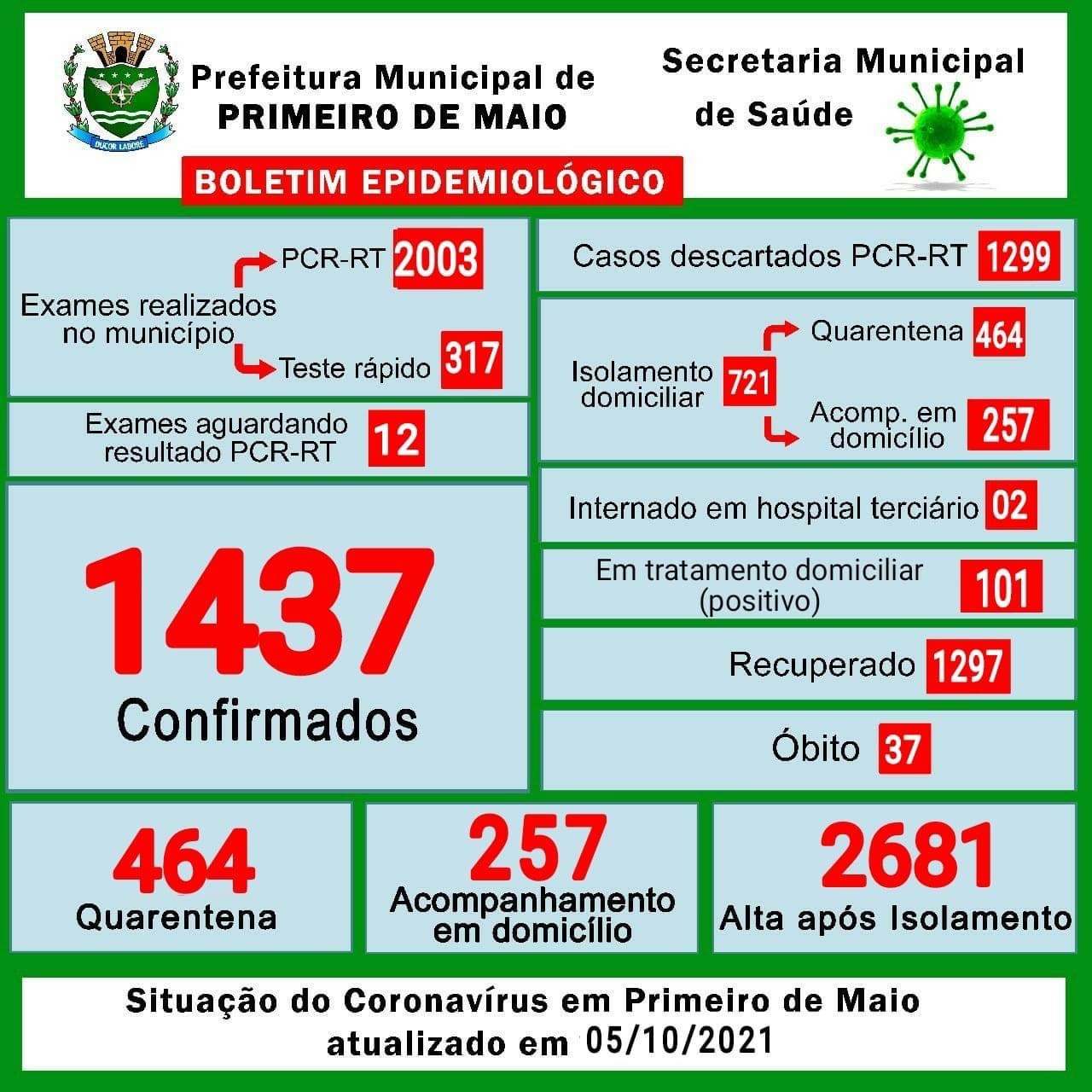 A Rádio Luas FM, através do Boletim Online oficial da Prefeitura de Primeiro de Maio, informa aos ouvintes a atual situação do vírus na cidade.