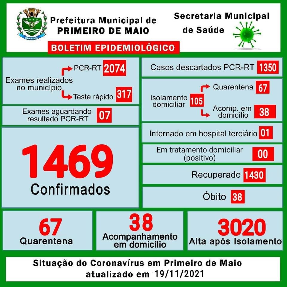 A Rádio Luas FM, através do Boletim Online oficial da Prefeitura de Primeiro de Maio, informa aos ouvintes a atual situação do vírus na cidade.